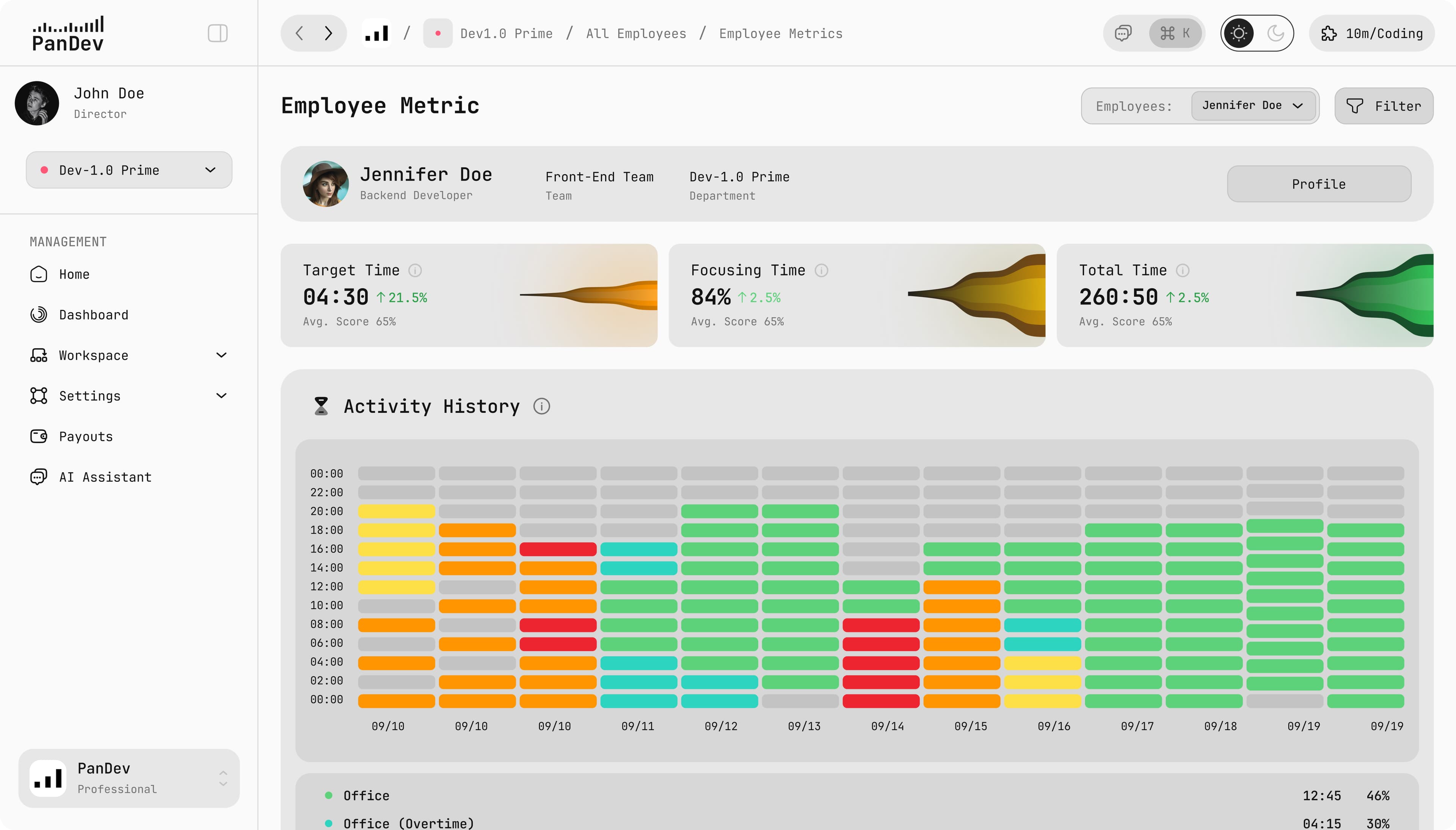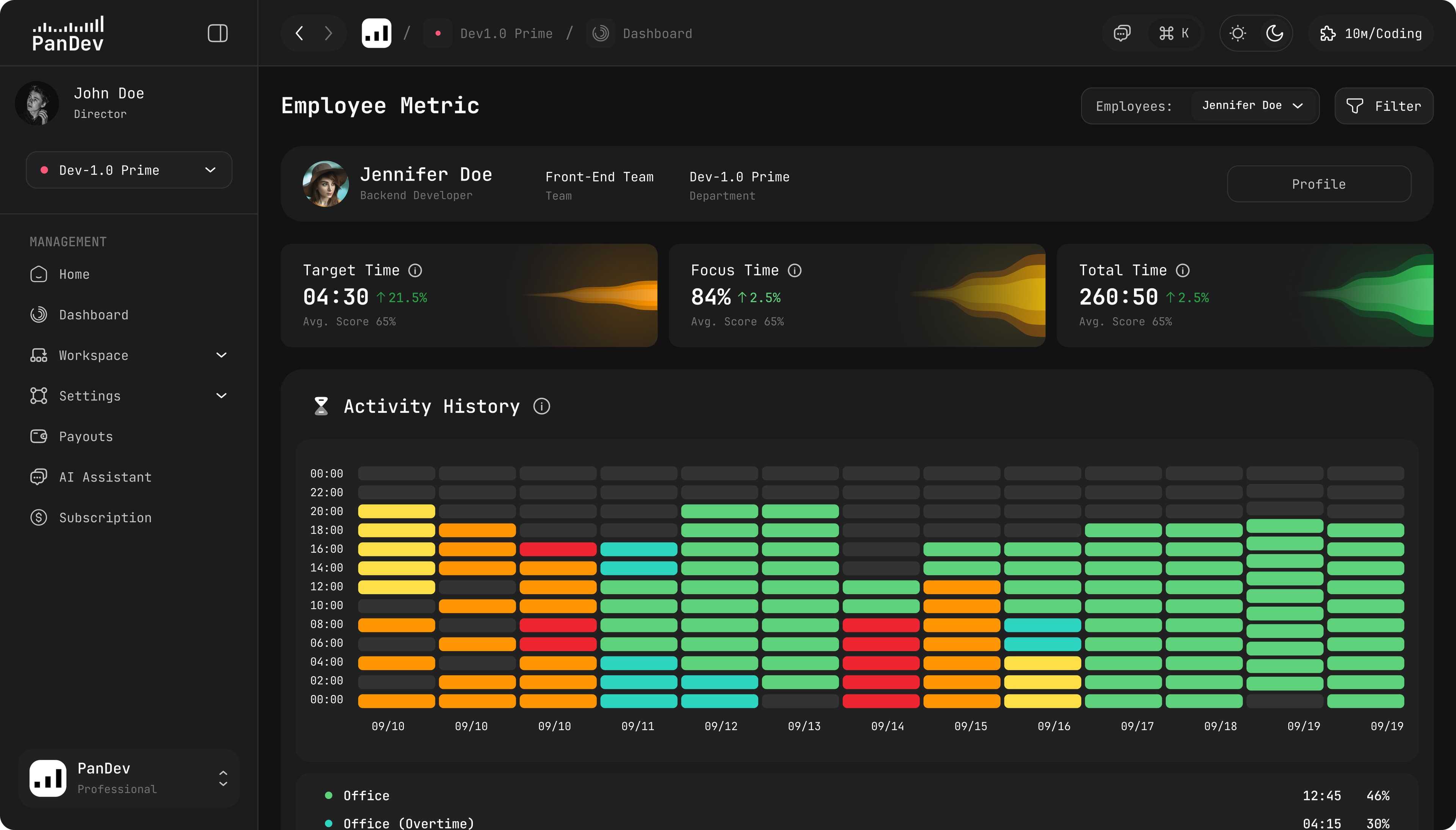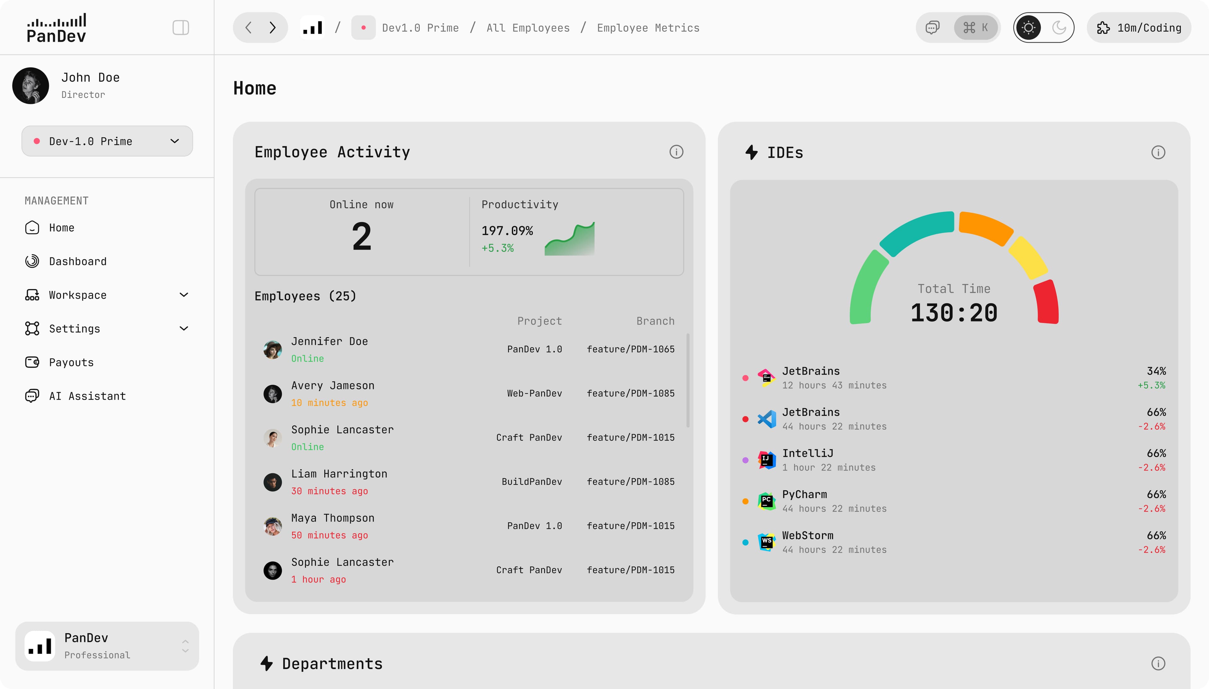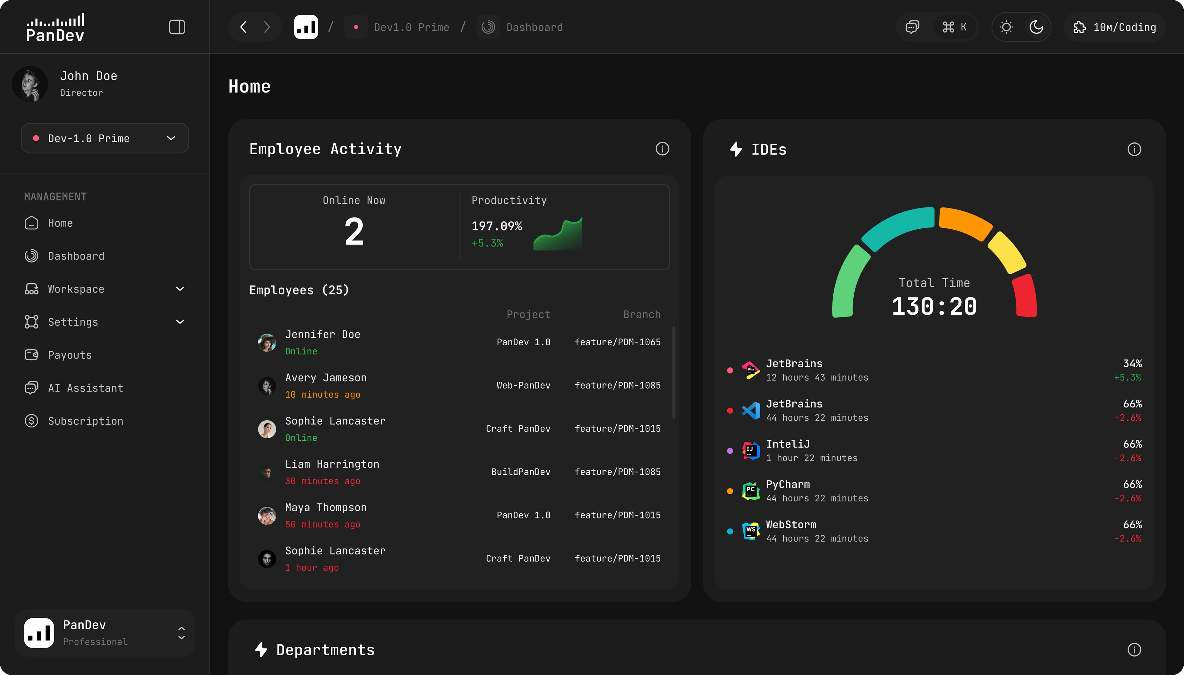 PanDev provides one view of development for all levels. From CEO to team lead, everyone sees the right level of detail and spends less time on reports and status calls.